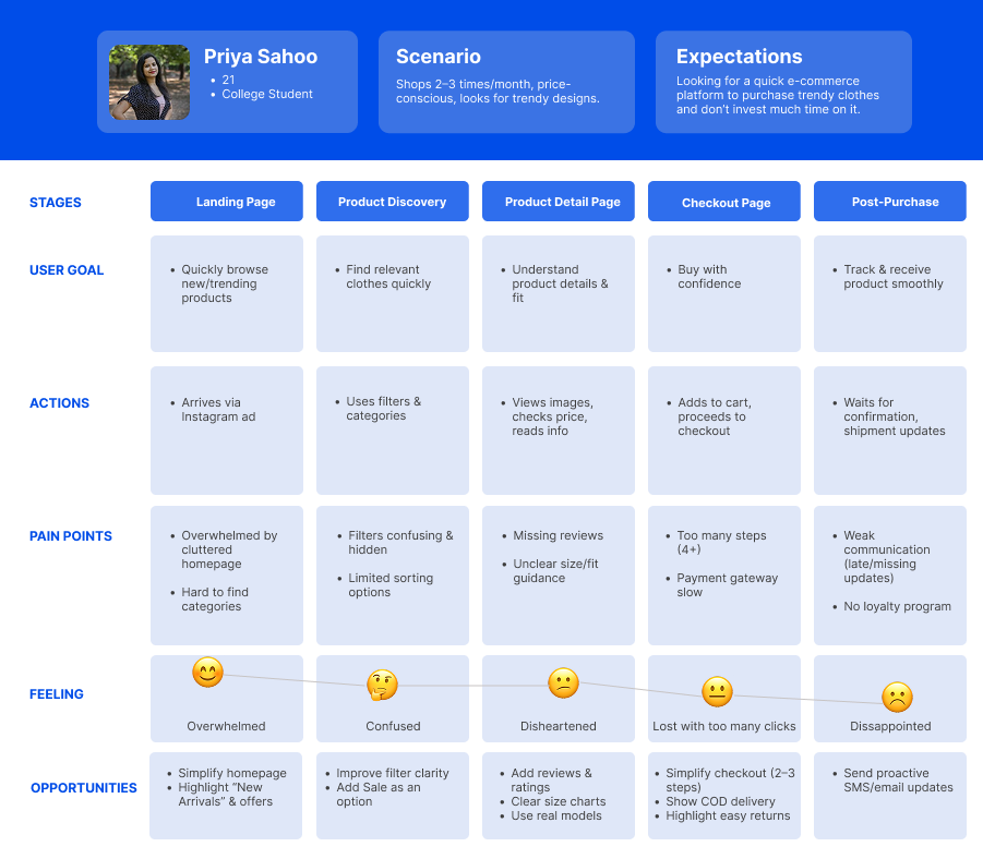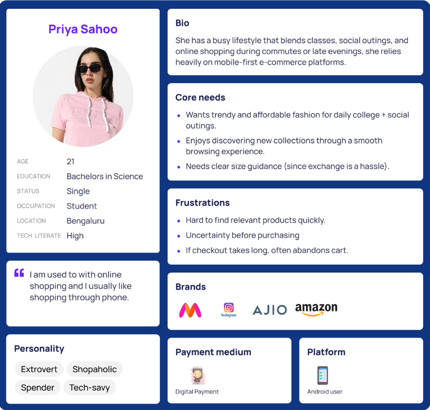 We created our user persona "College Shopper Priya, 21," who seeks trendy, affordable styles and shops 2–3 times a month. She currently faces trust and transparency issues due to the lack of reviews, delivery timelines, and return policy information. She wants a simpler, more reliable journey with relatable product visuals.